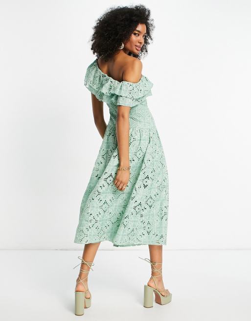 ASOS DESIGN one shoulder midi dress in patched lace in sage ASOS Very well made.
