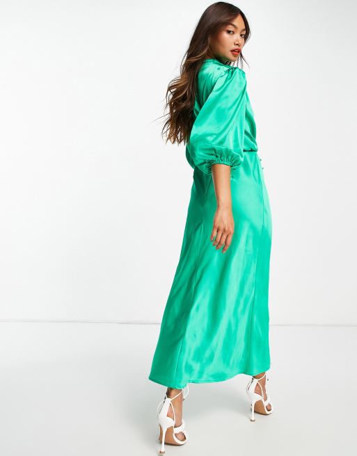 ASOS DESIGN pleat cowl neck satin midi tea dress with puff sleeve in emerald green Very well made.