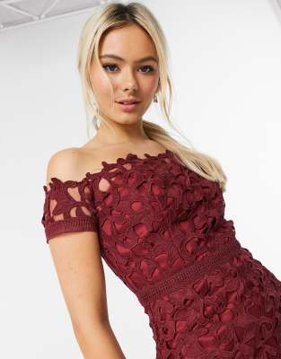 Chi Chi London lace bardot pencil dress in burgundy Very well made.