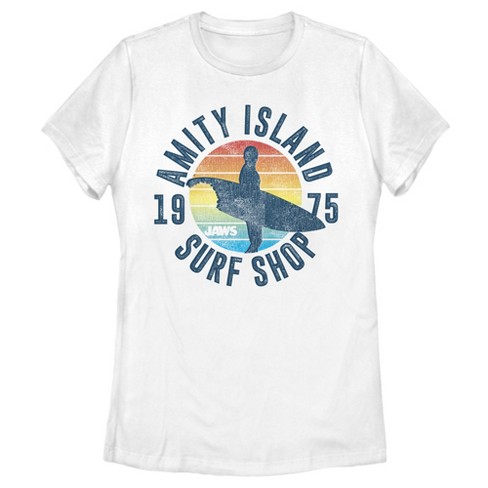 Women s Jaws Retro Amity Island Surf Shop T shirt White X Very well made.