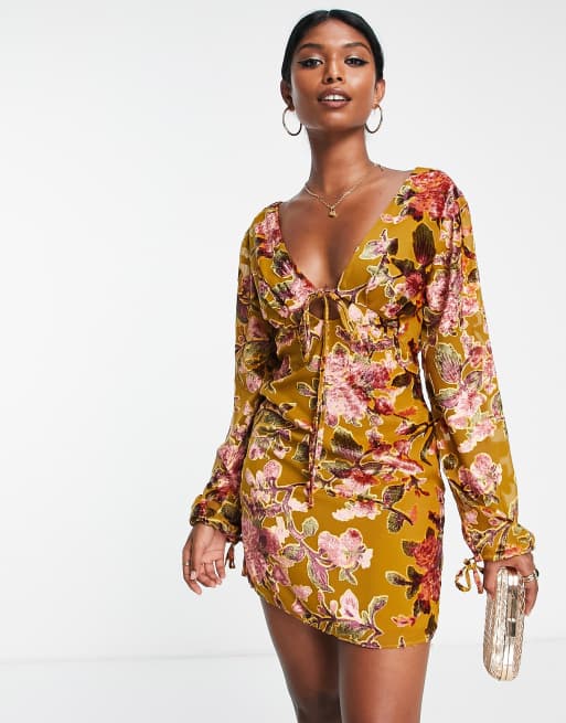 ASOS DESIGN tie front mini dress with floral devoree print in mustard Very well made.